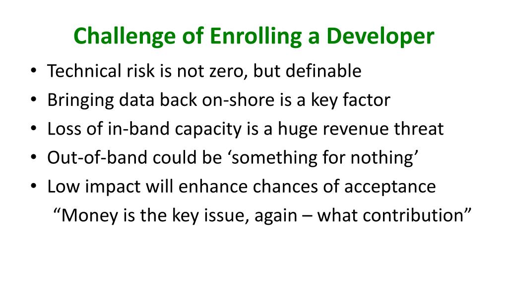 Challenge of Enrolling a Developer • Technical risk is not zero, but definable • Bringing data back on-shore is a key factor • Loss of in-band capacity is a huge revenue threat • Out-of-band could be ‘something for nothing’ • Low impact will enhance chances of acceptance “Money is the key issue, again – what contribution”