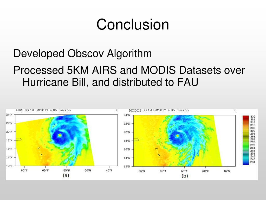 Conclusion Developed Obscov Algorithm Processed 5KM AIRS and MODIS Datasets over Hurricane Bill, and distributed to FAU