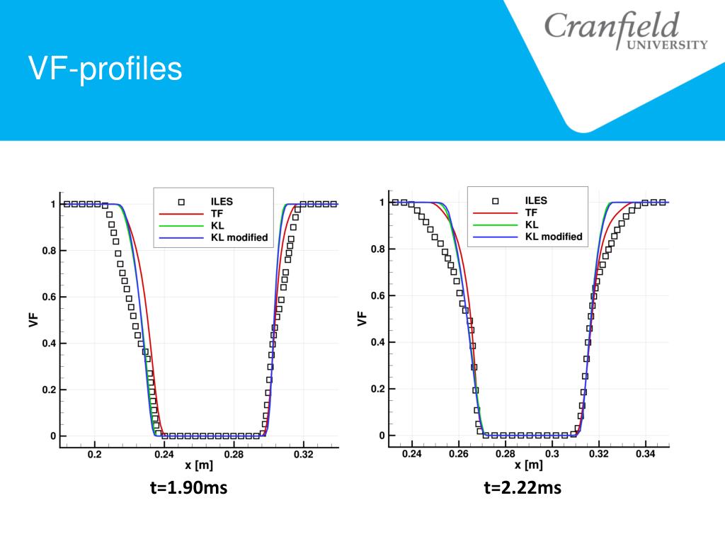 Validation The model results are compared against high-resolution ILES: • Profiles of volume fraction (VF); • Profiles of turbulent kinetic energy (K); • Integral quantities such as the Total MIX and Total Turbulent Kinetic Energy (Total TKE) are employed: • For comparison with 2D RANS simulations, the 3D ILES results are Favre-averaged to a 2D plane in the homogeneous spanwise direction, and a surface integral is applied instead; • The results need to be multiplied with a spanwise length (Lz) for consistency with the 3D quantities.