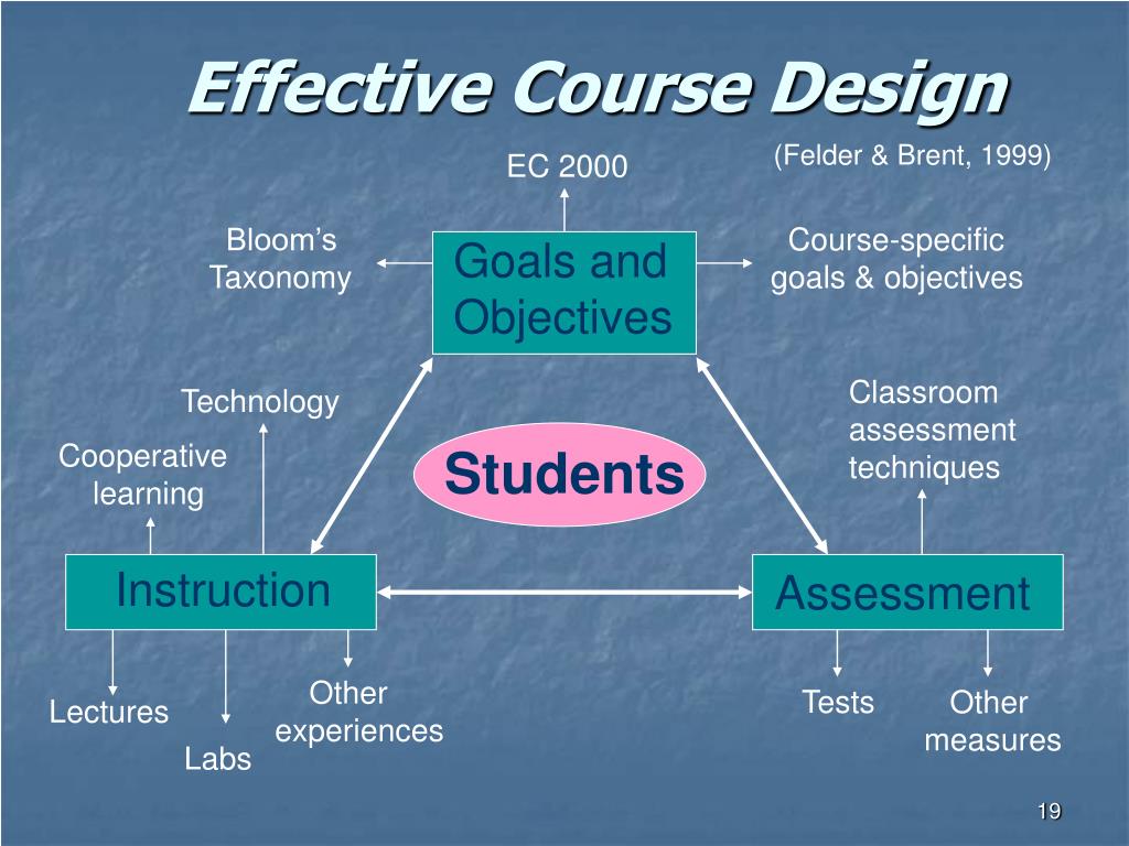 Goals and Objectives Instruction Effective Course Design (Felder & Brent, 1999) EC 2000 Bloom’s Taxonomy Course-specific goals & objectives Classroom assessment techniques Technology Cooperative learning Students Assessment Other experiences Tests Other measures Lectures Labs