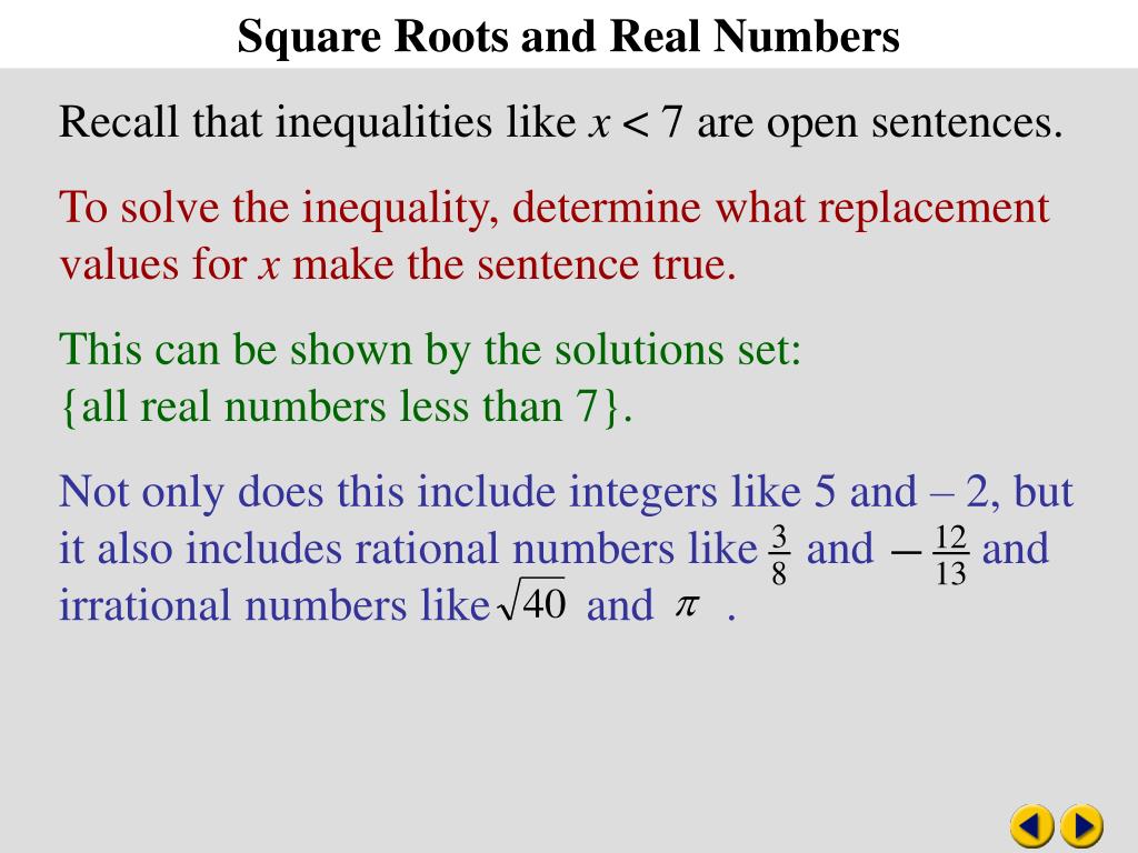 Square Roots and Real Numbers Recall that inequalities like x < 7 are open sentences. To solve the inequality, determine what replacement values for x make the sentence true. This can be shown by the solutions set:{all real numbers less than 7}. Not only does this include integers like 5 and – 2, but it also includes rational numbers like and and irrational numbers like and . Statistics
