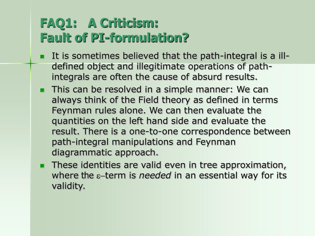 FAQ1: A Criticism: Fault of PI-formulation? • It is sometimes believed that the path-integral is a ill-defined object and illegitimate operations of path-integrals are often the cause of absurd results. • This can be resolved in a simple manner: We can always think of the Field theory as defined in terms Feynman rules alone. We can then evaluate the quantities on the left hand side and evaluate the result. There is a one-to-one correspondence between path-integral manipulations and Feynman diagrammatic approach. • These identities are valid even in tree approximation, where the e-term is needed in an essential way for its validity.