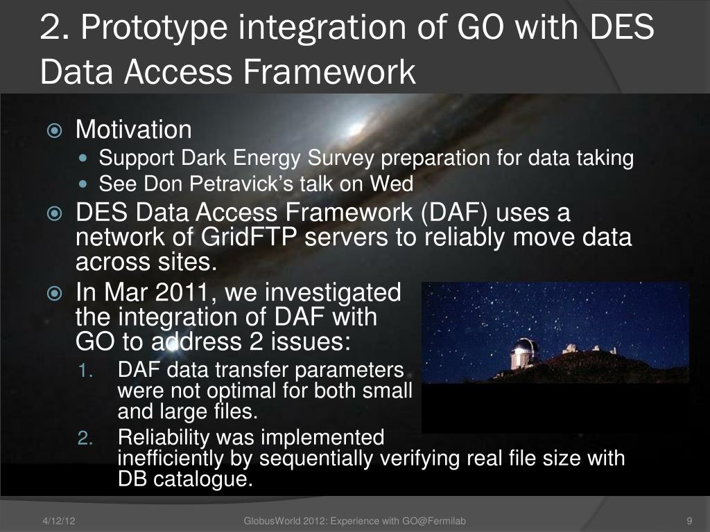 2. Prototype integration of GO with DES Data Access Framework • Motivation • Support Dark Energy Survey preparation for data taking • See Don Petravick’s talk on Wed • DES Data Access Framework (DAF) uses a network of GridFTP servers to reliably move data across sites. • In Mar 2011, we investigated the integration of DAF with GO to address 2 issues: • DAF data transfer parameters were not optimal for both small and large files. • Reliability was implemented inefficiently by sequentially verifying real file size with DB catalogue. GlobusWorld 2012: Experience with GO@Fermilab