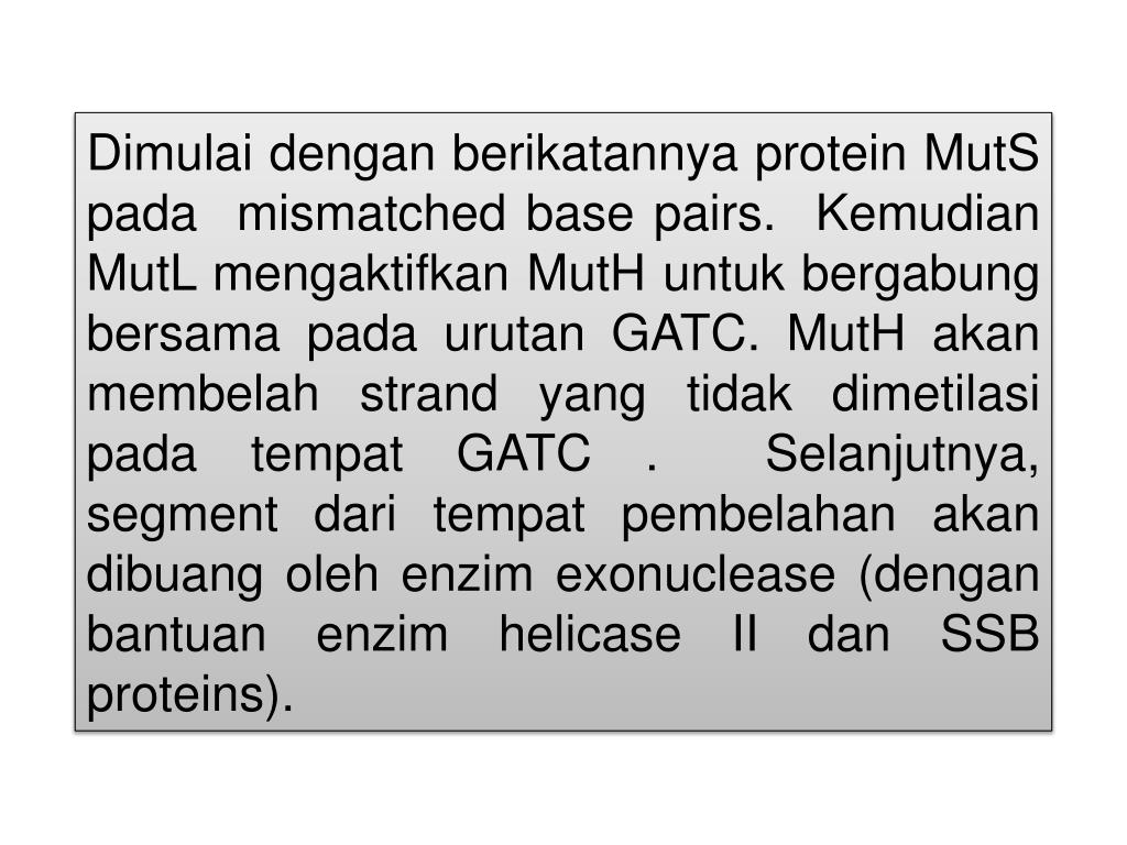 Mismatch repair (Perbaikan yang tidak berpasangan) Untuk memperbaiki basa yang tidak berpasangan harus diketahui pasangan basa mana yang salah. PadaE. coli, ini dapat diketahui oleh methylaseyang disebut dengan "Dam methylase", dimana dapat memetilasi adenines yang terdapat pada urutan (5')GATC . Segera sesudah replikasi DNA, template strand dimetilasi, tetapi strand yang baru disintesa belum dimetilasi. Jadi antara template strand dan new strand akan berbeda. .