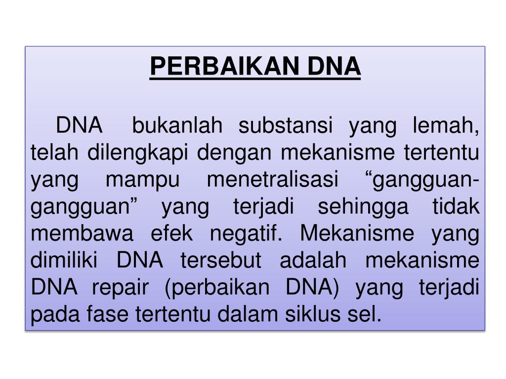 PERBAIKAN DNA DNA bukanlahsubstansi yang lemah,telahdilengkapidenganmekanismetertentu yang mampumenetralisasi “gangguan-gangguan” yang terjadisehinggatidakmembawaefeknegatif. Mekanisme yang dimiliki DNA tersebutadalahmekanisme DNA repair (perbaikan DNA) yang terjadipadafasetertentudalamsiklus sel.