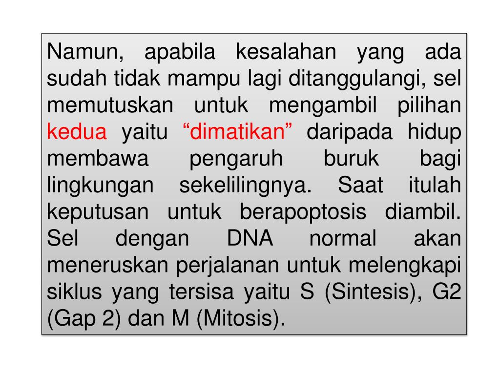 Namun, apabilakesalahan yang adasudahtidakmampulagiditanggulangi, selmemutuskanuntukmengambilpilihankeduayaitu“dimatikan” daripadahidupmembawapengaruhburukbagilingkungansekelilingnya. Saatitulahkeputusanuntukberapoptosisdiambil. Seldengan DNA normal akanmeneruskanperjalananuntukmelengkapisiklus yang tersisayaitu S (Sintesis), G2 (Gap 2) dan M (Mitosis).