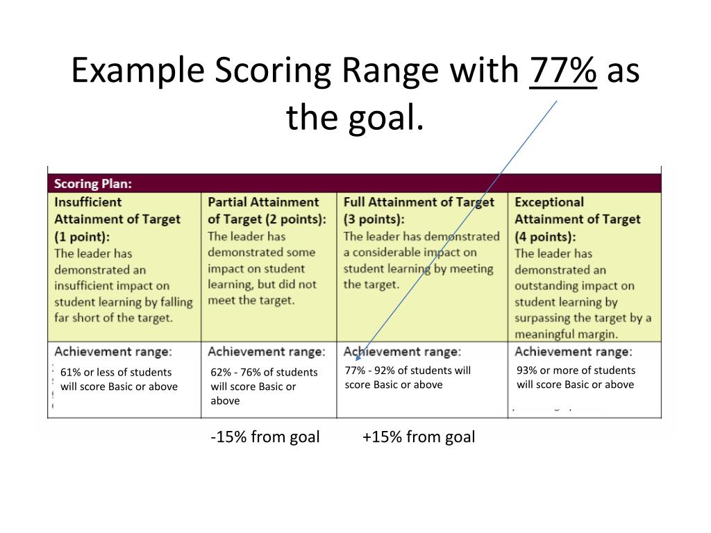 Example Scoring Range with 77% as the goal. 93% or more of students will score Basic or above 77% - 92% of students will score Basic or above 61% or less of students will score Basic or above 62% - 76% of students will score Basic or above -15% from goal +15% from goal