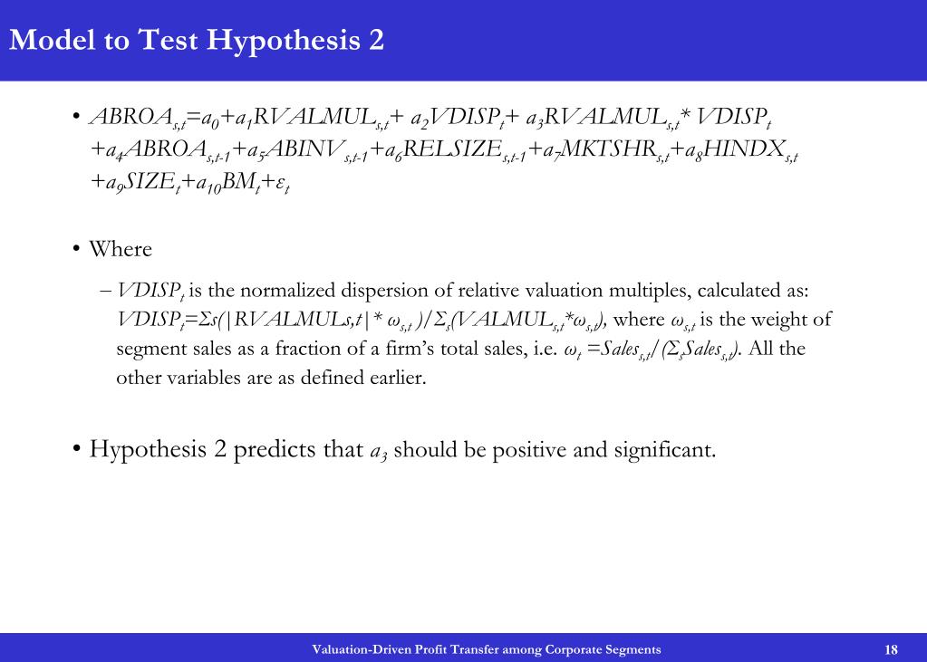 Model to Test Hypothesis 1 • ABROAs,t=a0+a1RVALMULs,t+a2ABROAs,t-1+a3ABINVs,t-1 +a4RELSIZEs,t-1+a5MKTSHRs,t+a6HINDXs,t+a7SIZEt+a8BMt+εt Where • ABINVs,t is the firm- and industry-adjusted abnormal investment as calculated as (INVs,t -IINVs,t )- Σs((INVs,t -IINVs,t ) * ωs,t ). INVs,t is the ratio of segment capital expenditure to identifiable assets. IINVs,t is the median ratio of capital expenditure to total assets of all single-segment firms in the same SIC three-digit industry in fiscal year. • RELSIZEs,t is calculated as the ratio of segment assets to firm assets at year t. • MKTSHRs,t is market share, calculated as the sales of segment s as the fraction of the total sales of all firm/segments with the same three-digit SIC code. • HINDXs,t is the Herfindahl index for the industry that a segment belongs to, where industry is again defined with three-digit SIC code. • SIZEt is logarithm of market cap of equity; • BMt is the book-to-market ratio.