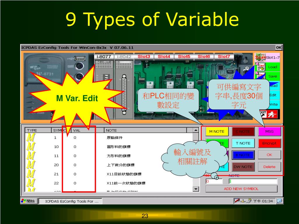 9 Types of Variable M Var. Edit 可供編寫文字字串,長度30個字元 和PLC相同的變數設定 輸入編號及相關註解 23