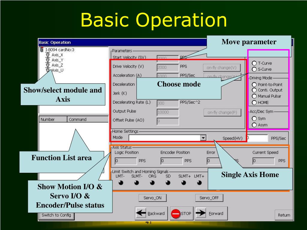 Basic Operation Move parameter Choose mode Show Motion I/O & Servo I/O & Encoder/Pulsestatus Show/select module and Axis Function List area Single Axis Home 41