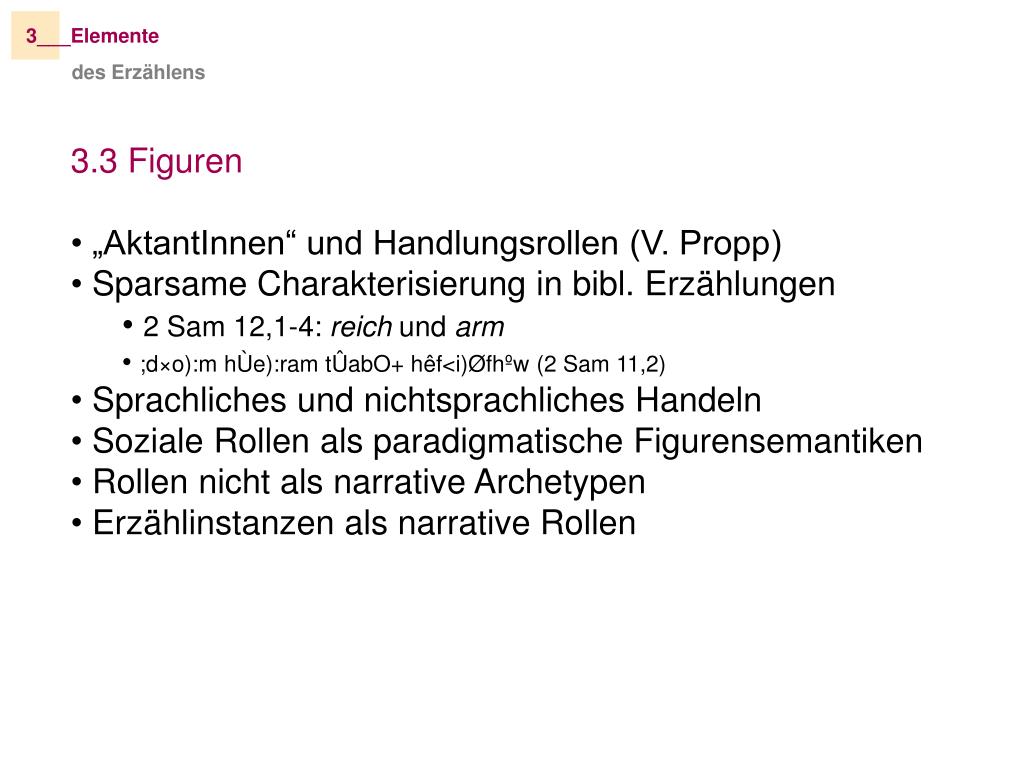 3__ _Elemente des Erzählens • 3.3 Figuren • „AktantInnen“ und Handlungsrollen (V. Propp) • Sparsame Charakterisierung in bibl. Erzählungen • 2 Sam 12,1-4: reich und arm • ;d×o):m hÙe):ram tÛabO+ hêf<i)Øfhºw(2 Sam 11,2) • Sprachliches und nichtsprachliches Handeln • Soziale Rollen als paradigmatische Figurensemantiken • Rollen nicht als narrative Archetypen • Erzählinstanzen als narrative Rollen