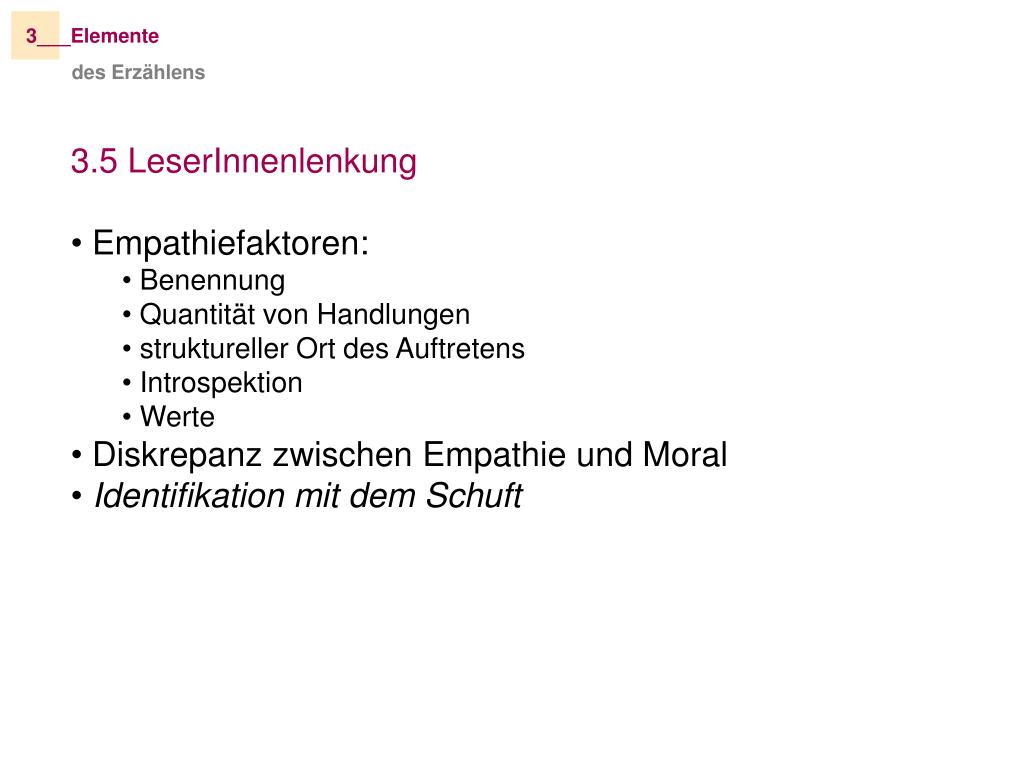 3__ _Elemente des Erzählens • 3.5 LeserInnenlenkung • Empathiefaktoren: • Benennung • Quantität von Handlungen • struktureller Ort des Auftretens • Introspektion • Werte • Diskrepanz zwischen Empathie und Moral • Identifikation mit dem Schuft