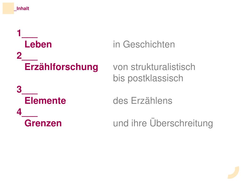 _Inhalt 1___ Leben in Geschichten 2___ Erzählforschung von strukturalistisch bis postklassisch 3___ Elemente des Erzählens 4___ Grenzen und ihre Überschreitung