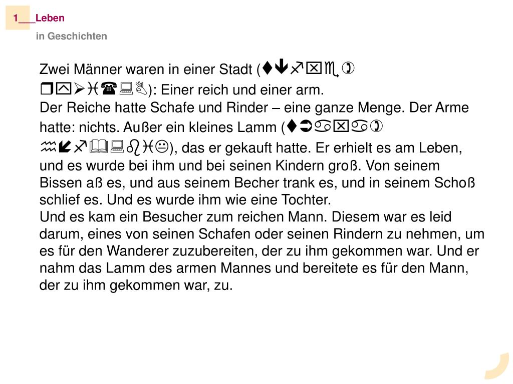 1__ _Leben in Geschichten Zwei Männer waren in einer Stadt (têfxe) ryØi(:B): Einer reich und einer arm. Der Reiche hatte Schafe und Rinder – eine ganze Menge. Der Arme hatte: nichts. Außer ein kleines Lamm (tÜaxa) híf&:biK), das er gekauft hatte. Er erhielt es am Leben, und es wurde bei ihm und bei seinen Kindern groß. Von seinem Bissen aß es, und aus seinem Becher trank es, und in seinem Schoß schlief es. Und es wurde ihm wie eine Tochter. Und es kam ein Besucher zum reichen Mann. Diesem war es leid darum, eines von seinen Schafen oder seinen Rindern zu nehmen, um es für den Wanderer zuzubereiten, der zu ihm gekommen war. Und er nahm das Lamm des armen Mannes und bereitete es für den Mann, der zu ihm gekommen war, zu.