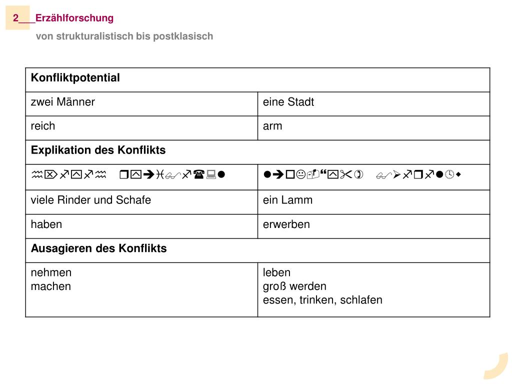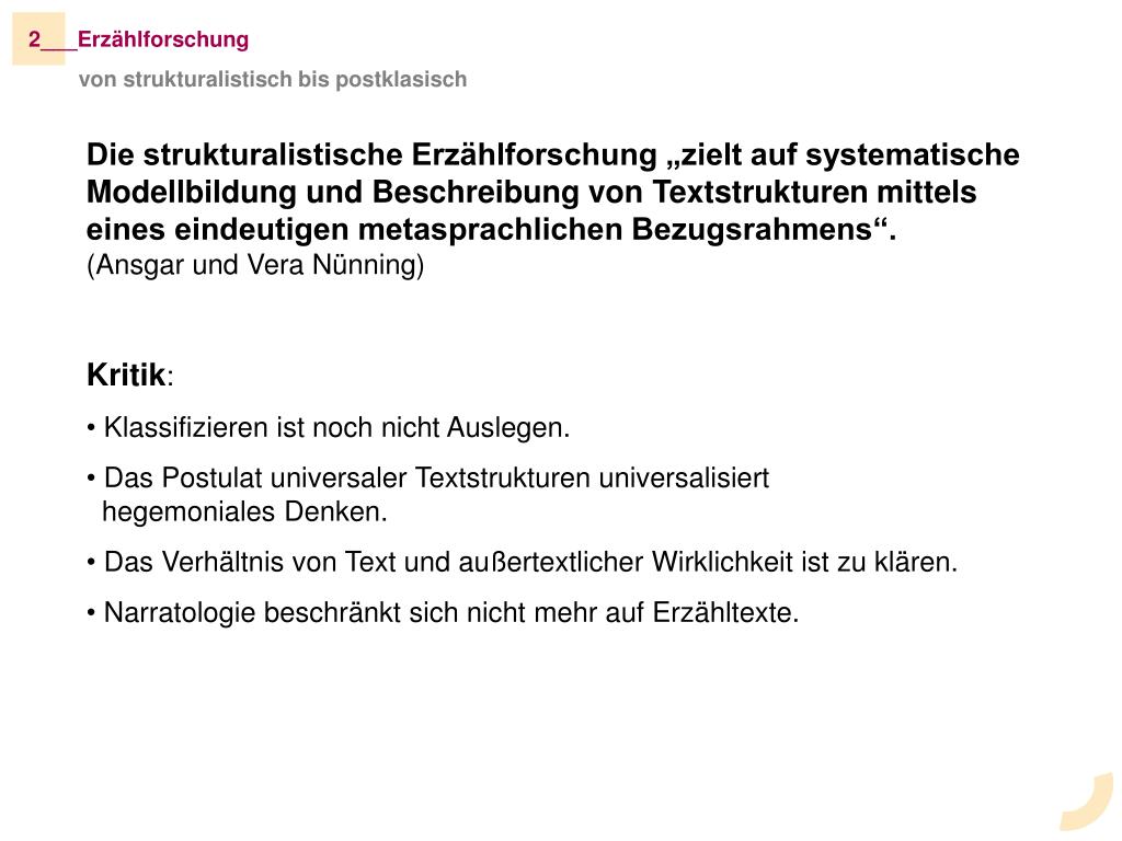 2__ _Erzählforschung von strukturalistisch bis postklasisch • Die strukturalistische Erzählforschung „zielt auf systematische Modellbildung und Beschreibung von Textstrukturen mittels eines eindeutigen metasprachlichen Bezugsrahmens“.(Ansgar und Vera Nünning) • Kritik: • Klassifizieren ist noch nicht Auslegen. • Das Postulat universaler Textstrukturen universalisiert hegemoniales Denken. • Das Verhältnis von Text und außertextlicher Wirklichkeit ist zu klären. • Narratologie beschränkt sich nicht mehr auf Erzähltexte.