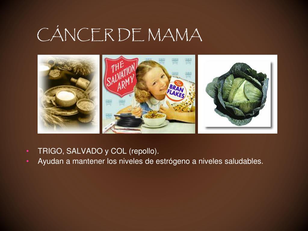 CÁNCER DE MAMA • TRIGO, SALVADO y COL (repollo). • Ayudan a mantener los niveles de estrógeno a niveles saludables.