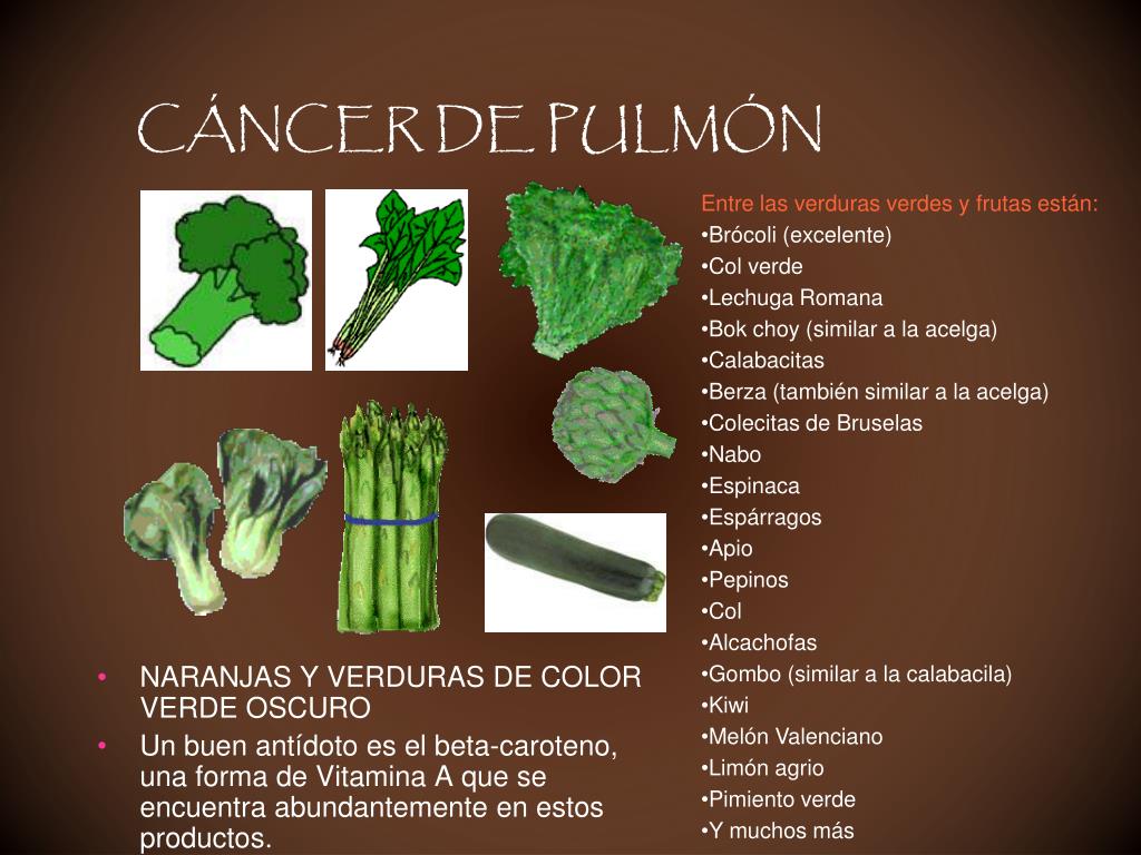 CÁNCER DE PULMÓN • Entre las verduras verdes y frutas están: • Brócoli (excelente) • Col verde • Lechuga Romana • Bok choy (similar a la acelga) • Calabacitas • Berza (también similar a la acelga) • Colecitas de Bruselas • Nabo • Espinaca • Espárragos • Apio • Pepinos • Col • Alcachofas • Gombo (similar a la calabacila) • Kiwi • Melón Valenciano • Limón agrio • Pimiento verde • Y muchos más • NARANJAS Y VERDURAS DE COLOR VERDE OSCURO • Un buen antídoto es el beta-caroteno, una forma de Vitamina A que se encuentra abundantemente en estos productos.