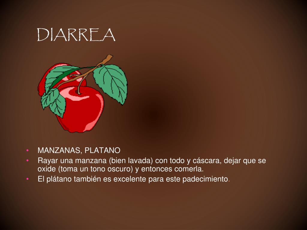DIARREA • MANZANAS, PLATANO • Rayar una manzana (bien lavada) con todo y cáscara, dejar que se oxide (toma un tono oscuro) y entonces comerla. • El plátano también es excelente para este padecimiento.