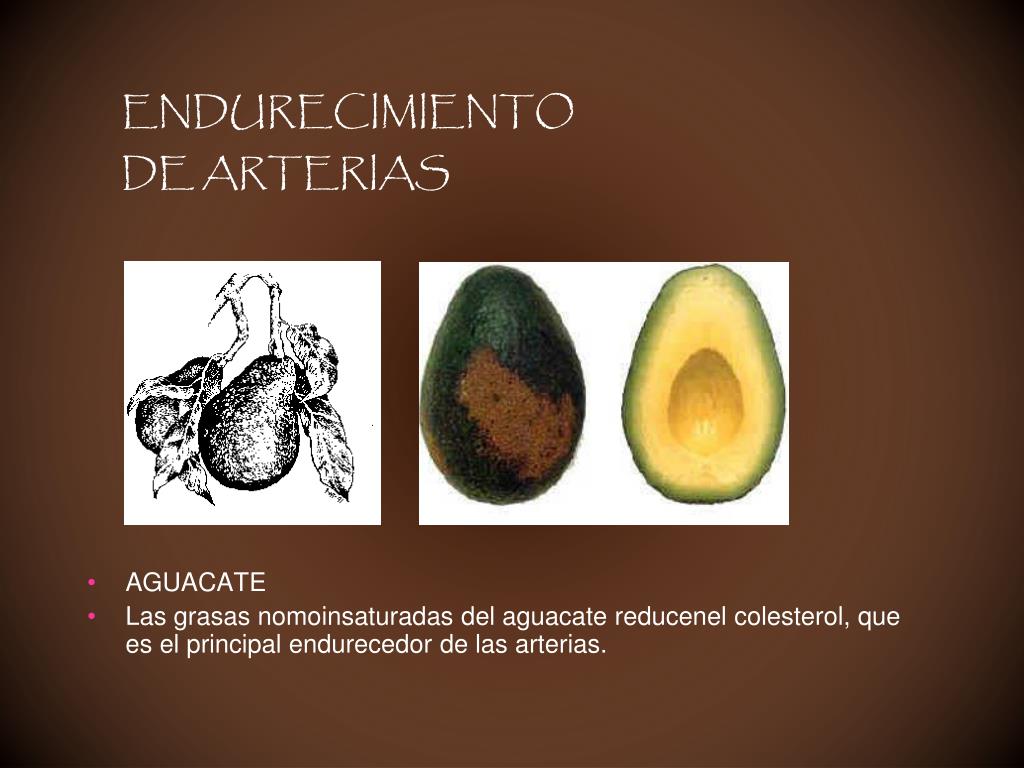 ENDURECIMIENTO DE ARTERIAS • AGUACATE • Las grasas nomoinsaturadas del aguacate reducenel colesterol, que es el principal endurecedor de las arterias.