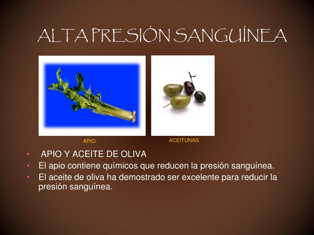 ACEITUNAS APIO ALTA PRESIÓN SANGUÍNEA • APIO Y ACEITE DE OLIVA • El apio contiene químicos que reducen la presión sanguínea. • El aceite de oliva ha demostrado ser excelente para reducir la presión sanguínea.