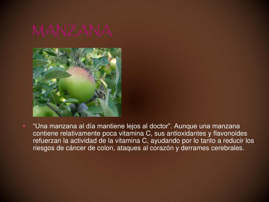 MANZANA • “Una manzana al día mantiene lejos al doctor”. Aunque una manzana contiene relativamente poca vitamina C, sus antioxidantes y flavonoides refuerzan la actividad de la vitamina C, ayudando por lo tanto a reducir los riesgos de cáncer de colon, ataques al corazón y derrames cerebrales.