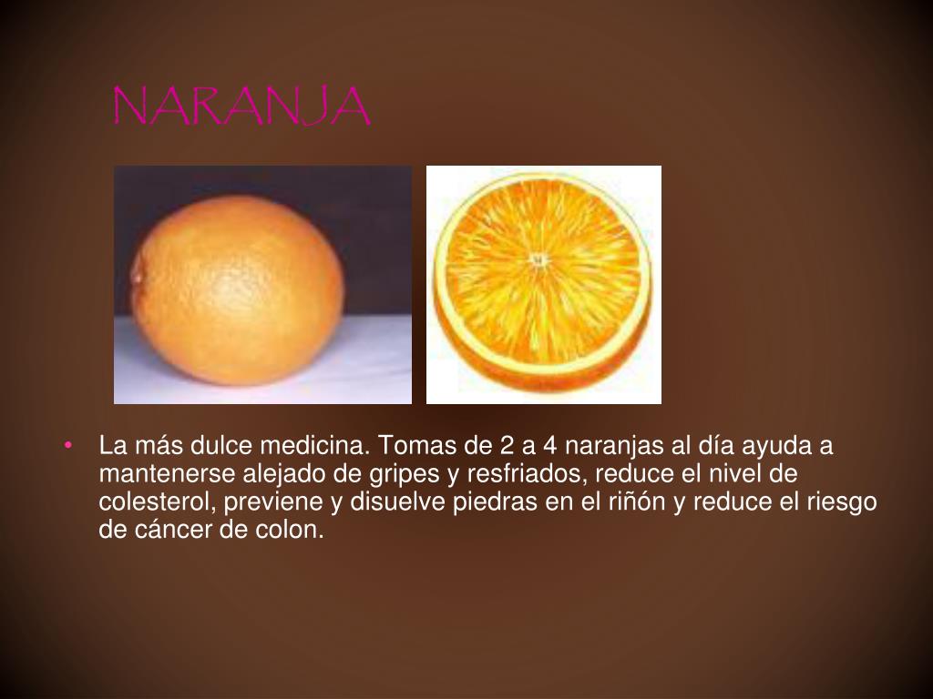 NARANJA • La más dulce medicina. Tomas de 2 a 4 naranjas al día ayuda a mantenerse alejado de gripes y resfriados, reduce el nivel de colesterol, previene y disuelve piedras en el riñón y reduce el riesgo de cáncer de colon.
