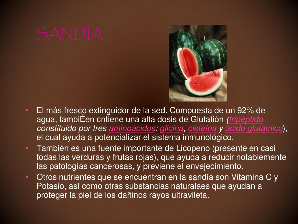 SANDÍA • El más fresco extinguidor de la sed. Compuesta de un 92% de agua, tambiÉen cntiene una alta dosis de Glutatión (tripéptido constituido por tres aminoácidos: glicina, cisteína y ácido glutámico), el cual ayuda a potencializar el sistema inmunológico. • También es una fuente importante de Licopeno (presente en casi todas las verduras y frutas rojas), que ayuda a reducir notablemente las patologías cancerosas, y previene el envejecimiento. • Otros nutrientes que se encuentran en la sandía son Vitamina C y Potasio, así como otras substancias naturalaes que ayudan a proteger la piel de los dañinos rayos ultravileta.