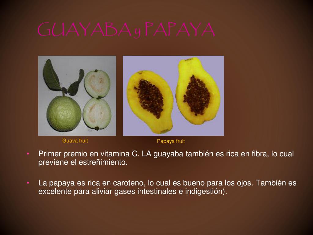 Guava fruit Papaya fruit GUAYABA y PAPAYA • Primer premio en vitamina C. LA guayaba también es rica en fibra, lo cual previene el estreñimiento. • La papaya es rica en caroteno, lo cual es bueno para los ojos. También es excelente para aliviar gases intestinales e indigestión).
