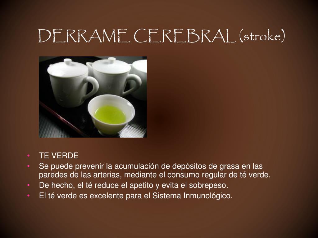 DERRAME CEREBRAL (stroke) • TE VERDE • Se puede prevenir la acumulación de depósitos de grasa en las paredes de las arterias, mediante el consumo regular de té verde. • De hecho, el té reduce el apetito y evita el sobrepeso. • El té verde es excelente para el Sistema Inmunológico.