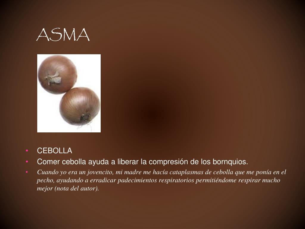 ASMA • CEBOLLA • Comer cebolla ayuda a liberar la compresión de los bornquios. • Cuando yo era un jovencito, mi madre me hacía cataplasmas de cebolla que me ponía en el pecho, ayudando a erradicar padecimientos respiratorios permitiéndome respirar mucho mejor (nota del autor).