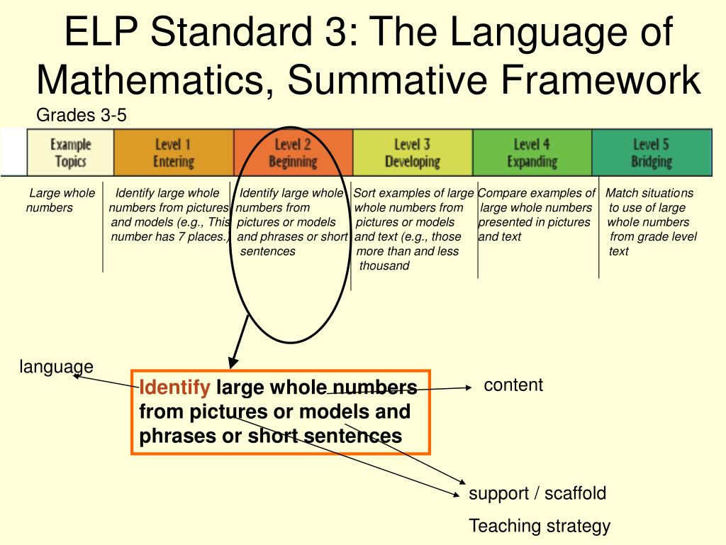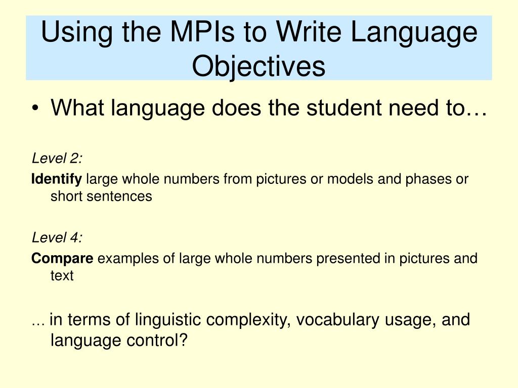 Using the MPIs to Write Language Objectives • What language does the student need to… Level 2: Identify large whole numbers from pictures or models and phases or short sentences Level 4: Compare examples of large whole numbers presented in pictures and text … in terms of linguistic complexity, vocabulary usage, and language control?