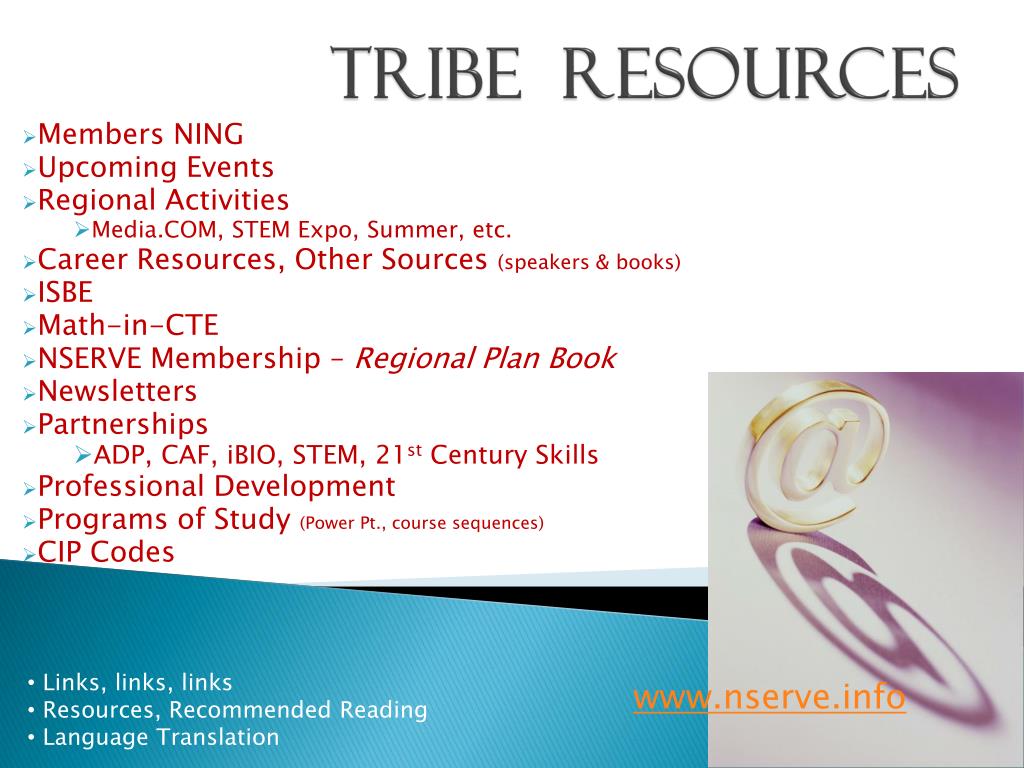 Tribe Resources Members NING Upcoming Events Regional Activities Media.COM, STEM Expo, Summer, etc. Career Resources, Other Sources (speakers & books) ISBE Math-in-CTE NSERVE Membership – Regional Plan Book Newsletters Partnerships ADP, CAF, iBIO, STEM, 21st Century Skills Professional Development Programs of Study (Power Pt., course sequences) CIP Codes • Links, links, links • Resources, Recommended Reading • Language Translation www.nserve.info