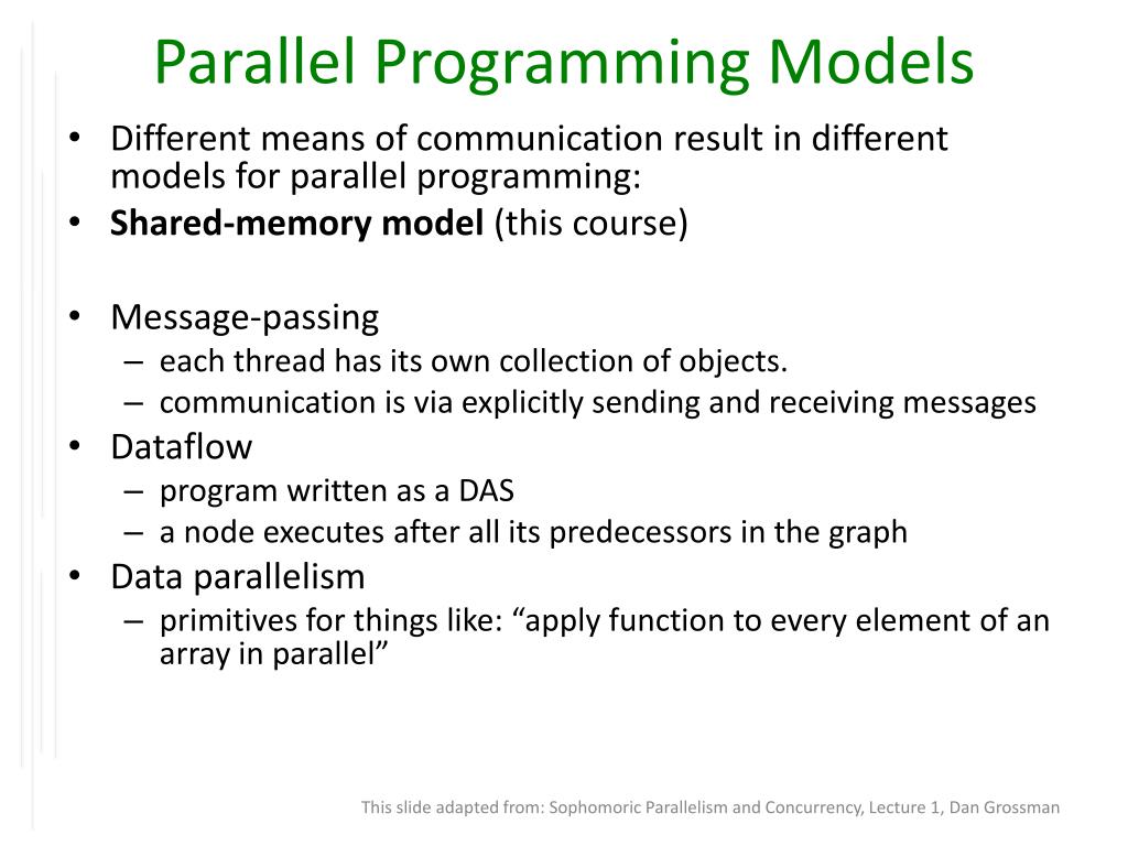 Parallel Programming Models • Different means of communication result in different models for parallel programming: • Shared-memory model (this course) • Message-passing • each thread has its own collection of objects. • communication is via explicitly sending and receiving messages • Dataflow • program written as a DAS • a node executes after all its predecessors in the graph • Data parallelism • primitives for things like: “apply function to every element of an array in parallel” This slide adapted from: Sophomoric Parallelism and Concurrency, Lecture 1, Dan Grossman