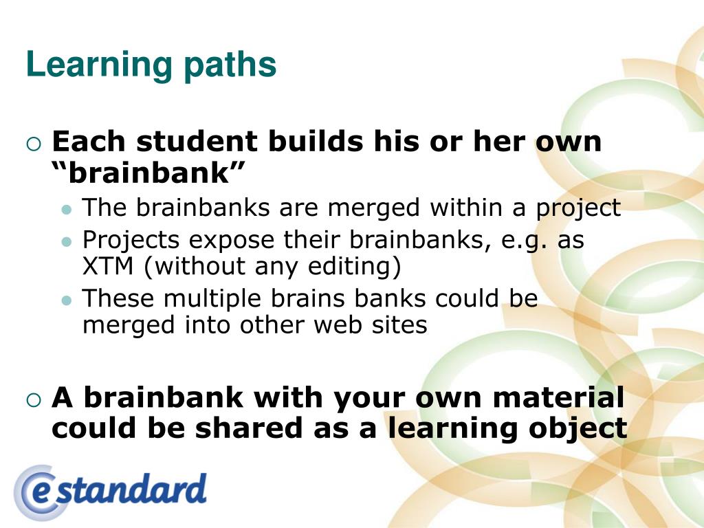 Learning paths • Each student builds his or her own “brainbank” • The brainbanks are merged within a project • Projects expose their brainbanks, e.g. as XTM (without any editing) • These multiple brains banks could be merged into other web sites • A brainbank with your own material could be shared as a learning object