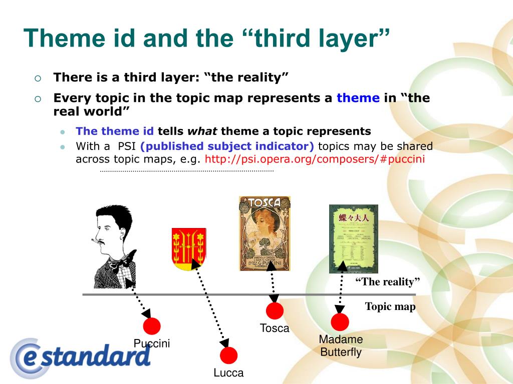 Tosca MadameButterfly Puccini Lucca Theme id and the “third layer” • There is a third layer: “the reality” • Every topic in the topic map represents a theme in “the real world” • The theme id tells what theme a topic represents • With a PSI (published subject indicator) topics may be shared across topic maps, e.g. http://psi.opera.org/composers/#puccini “The reality” Topic map