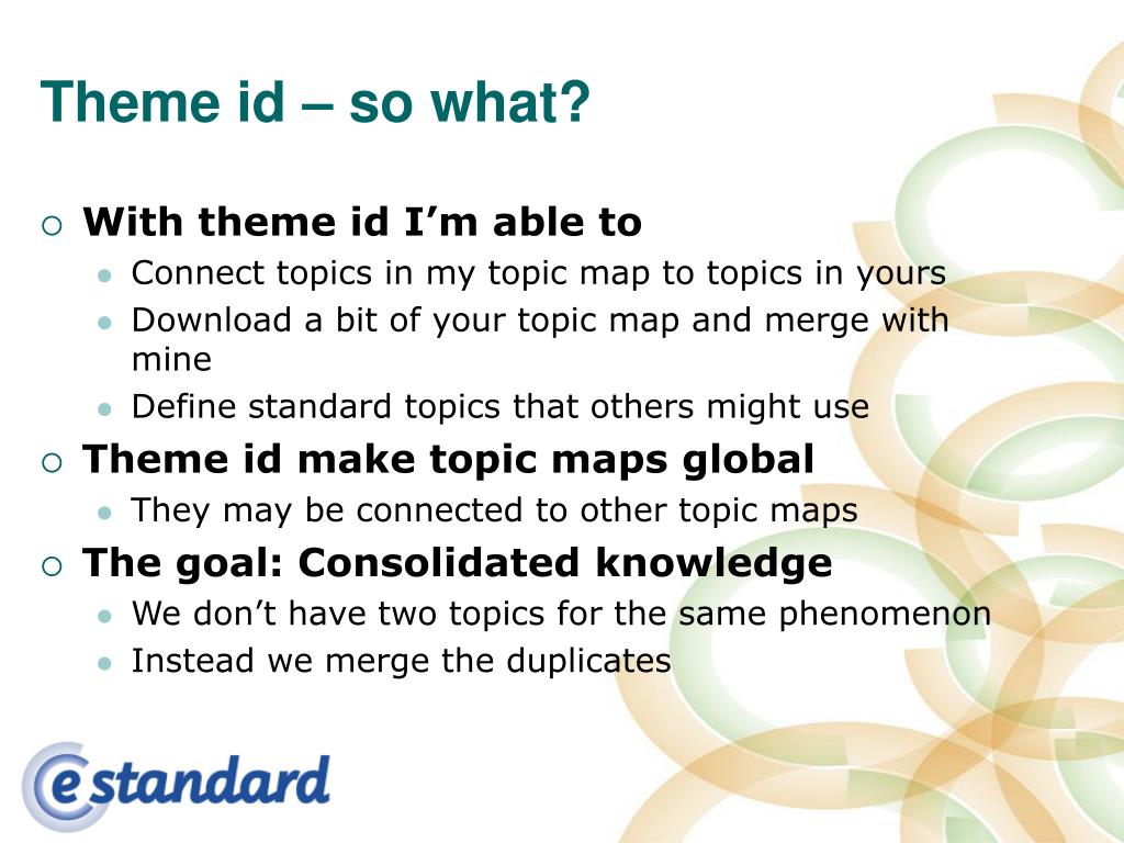 Theme id – so what? • With theme id I’m able to • Connect topics in my topic map to topics in yours • Download a bit of your topic map and merge with mine • Define standard topics that others might use • Theme id make topic maps global • They may be connected to other topic maps • The goal: Consolidated knowledge • We don’t have two topics for the same phenomenon • Instead we merge the duplicates