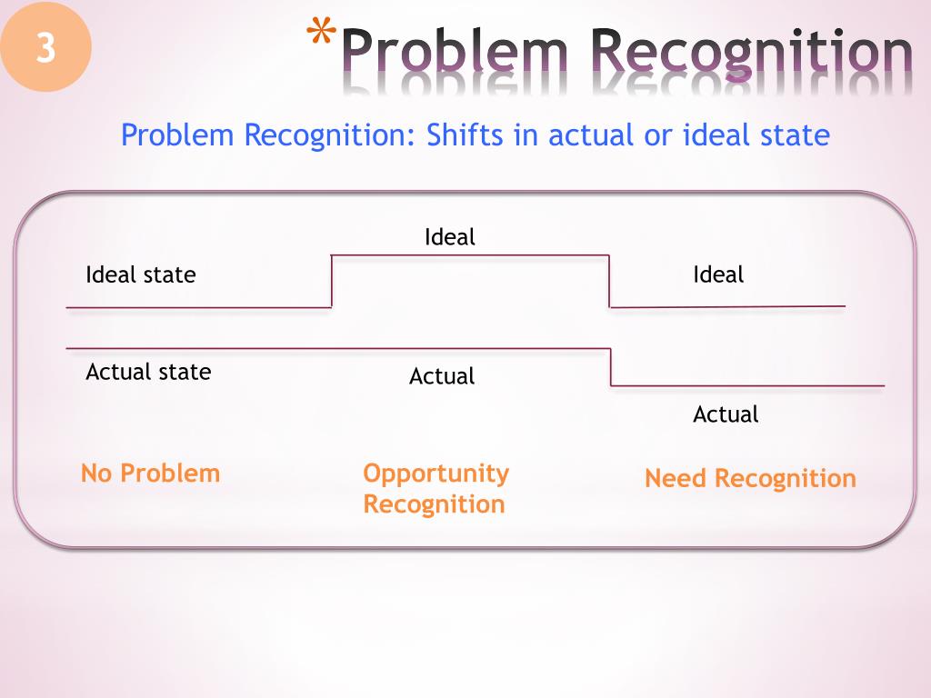 3 Problem Recognition: Shifts in actual or ideal state Ideal Ideal Ideal state Problem Recognition Actual state Actual Actual No Problem Opportunity Recognition Need Recognition