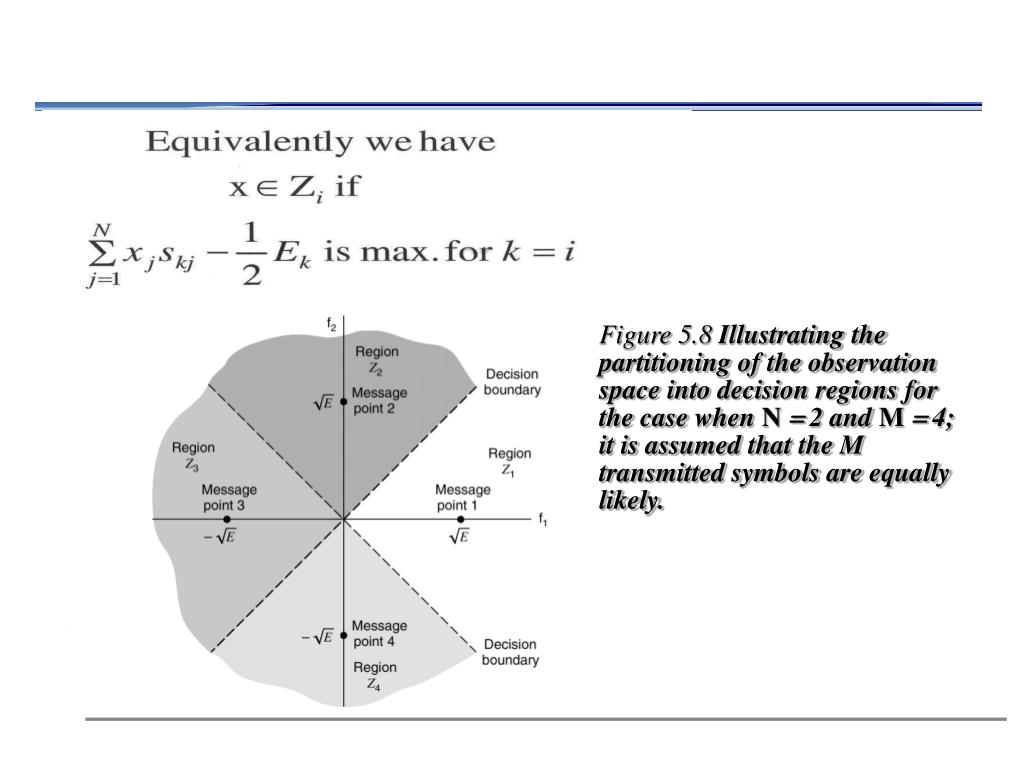 Figure 5.8 Illustrating the partitioning of the observation space into decision regions for the case when N 2 and M 4; it is assumed that the M transmitted symbols are equally likely.