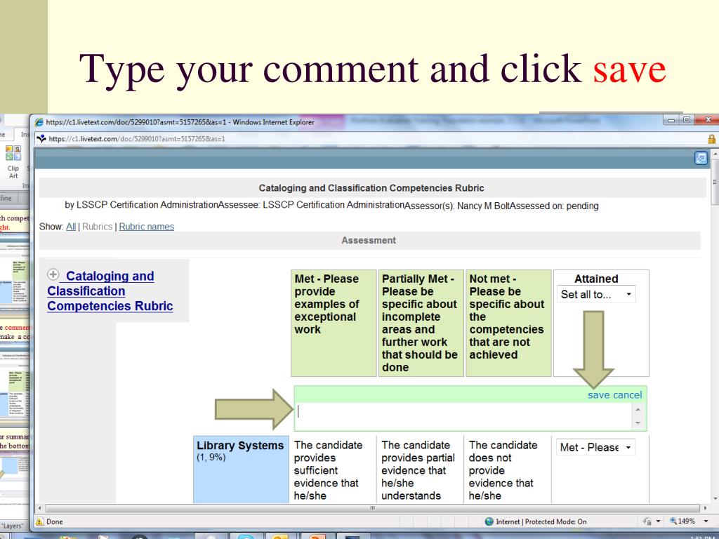 Your Assessment • If “partially met” or “not met” please indicate your reasons and what the candidate would have to do to make the work acceptable. • This is how you do this: • Click on the down arrow in the box • Choose your rating • Click on add comment • Write your comment • Save your comment for each competency