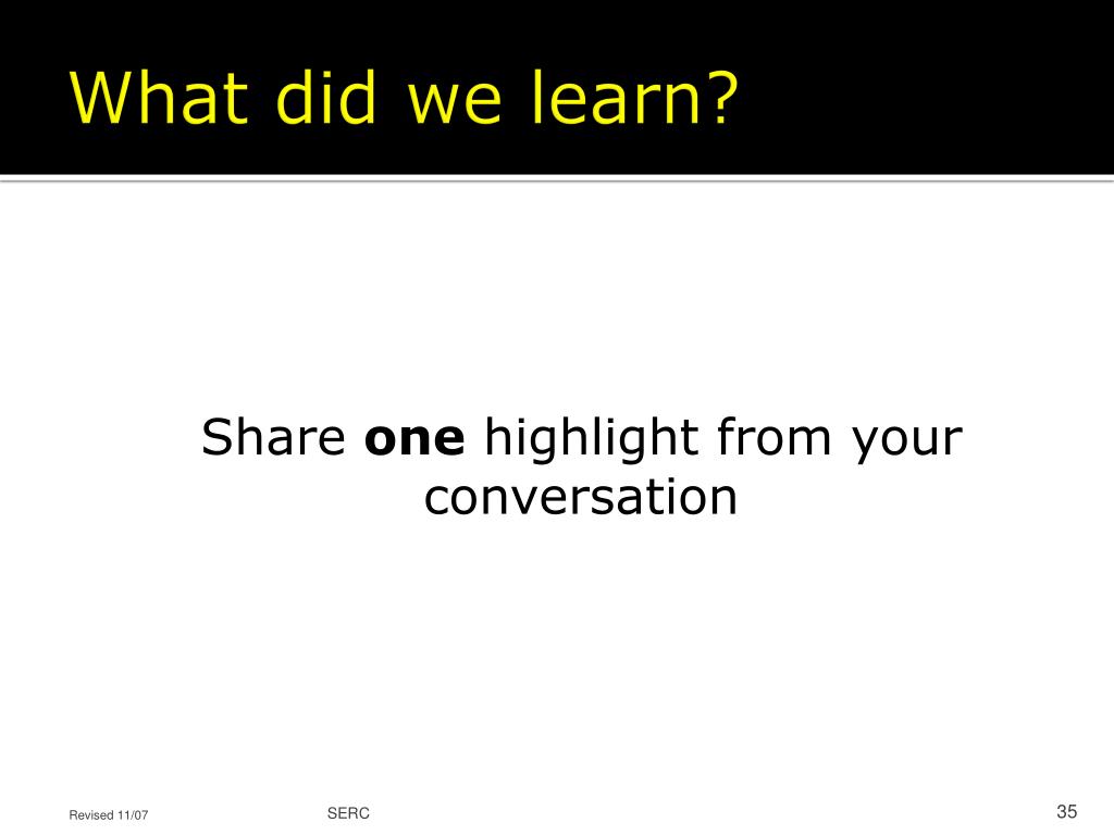 What did we learn? • 3 practices you will keep • 2 practices you will change • 1 remaining question SERC