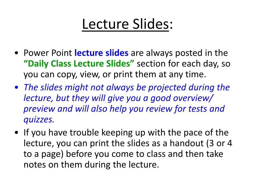 Lecture Slides: • Power Point lecture slides are always posted in the “Daily Class Lecture Slides” section for each day, so you can copy, view, or print them at any time. • The slides might not always be projected during the lecture, but they will give you a good overview/ preview and will also help you review for tests and quizzes. • If you have trouble keeping up with the pace of the lecture, you can print the slides as a handout (3 or 4 to a page) before you come to class and then take notes on them during the lecture.