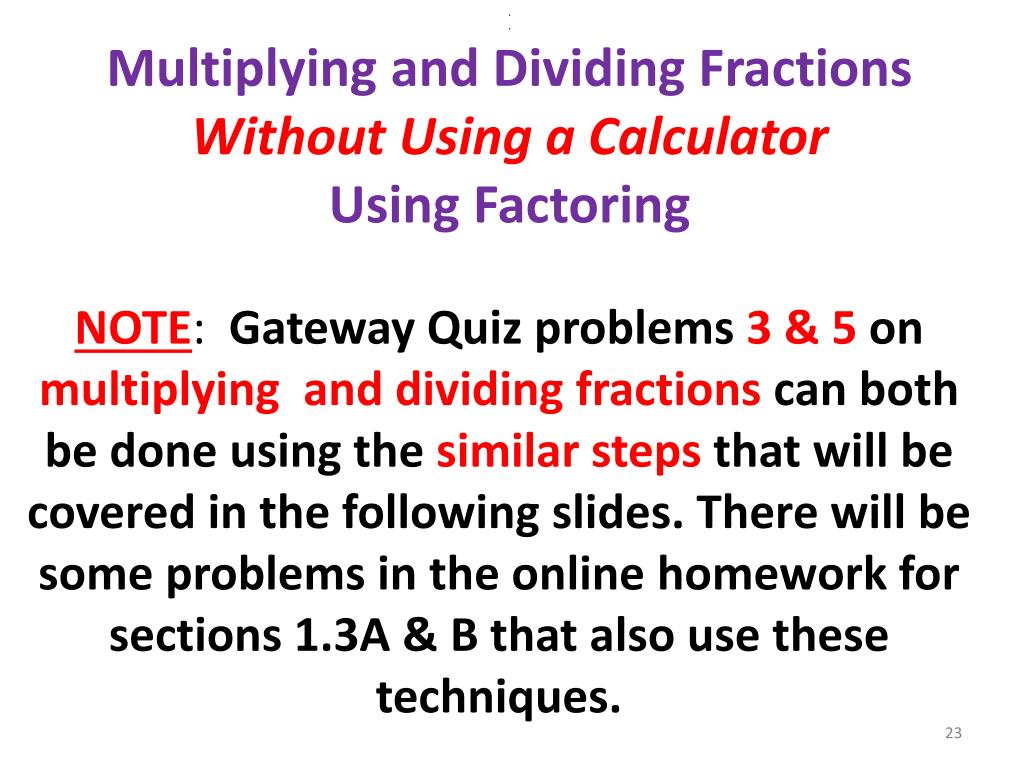 ..Multiplying and Dividing Fractions Without Using a CalculatorUsing Factoring NOTE: Gateway Quiz problems 3 & 5 on multiplying and dividing fractions canboth be done using the similar stepsthat will be covered in the following slides. There will be some problems in the online homework for sections 1.3A & B that also use these techniques.
