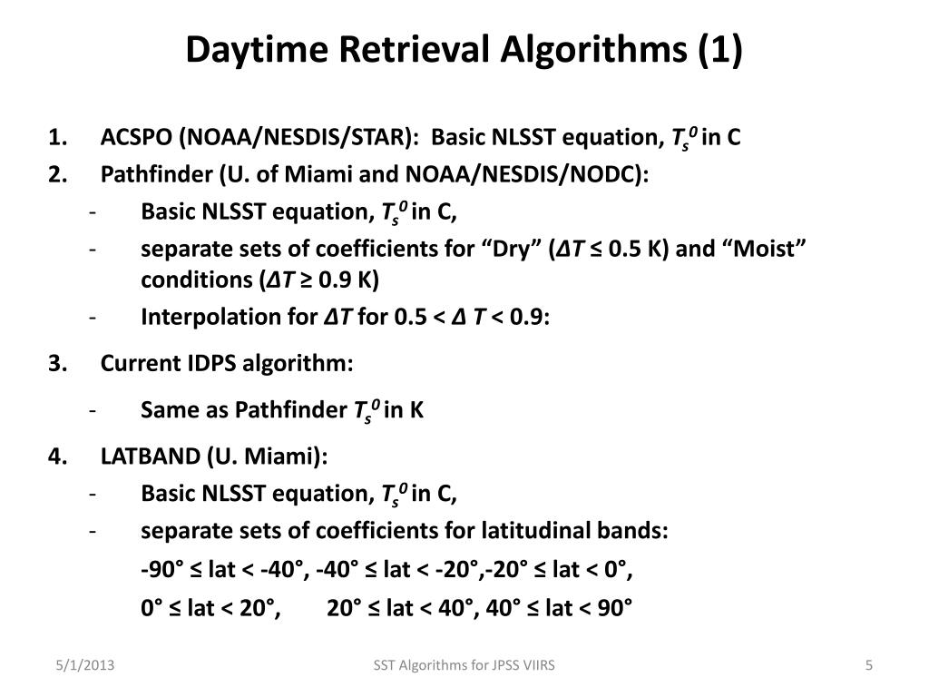 Daytime Retrieval Algorithms (1) • ACSPO (NOAA/NESDIS/STAR): Basic NLSST equation, Ts0 in C • Pathfinder (U. of Miami and NOAA/NESDIS/NODC): • Basic NLSST equation, Ts0 in C, • separate sets of coefficients for “Dry” (ΔT ≤ 0.5 K) and “Moist” conditions (ΔT ≥ 0.9 K) • Interpolation for ΔT for 0.5 < Δ T < 0.9: • Current IDPS algorithm: • Same as Pathfinder Ts0 in K • LATBAND (U. Miami): • Basic NLSST equation, Ts0 in C, • separate sets of coefficients for latitudinal bands: -90° ≤ lat < -40°, -40° ≤ lat < -20°,-20° ≤ lat < 0°, 0° ≤ lat < 20°, 20° ≤ lat < 40°, 40° ≤ lat < 90° SST Algorithms for JPSS VIIRS