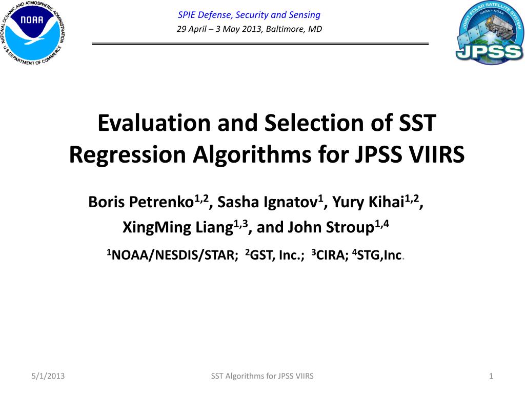 SPIE Defense, Security and Sensing 29 April – 3 May 2013, Baltimore, MD. Evaluation and Selection of SST Regression Algorithms for JPSS VIIRS. Boris Petrenko 1,2 , Sasha Ignatov 1 , Yury Kihai 1,2 , XingMing Liang 1,3 , and John Stroup 1,4