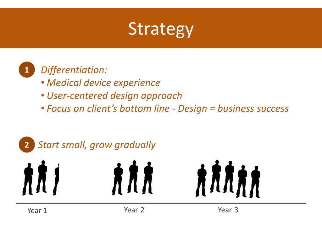 Strategy 1 • Differentiation: • Medical device experience • User-centered design approach • Focus on client’s bottom line - Design = business success Start small, grow gradually 2 Year2 Year3 Year 1
