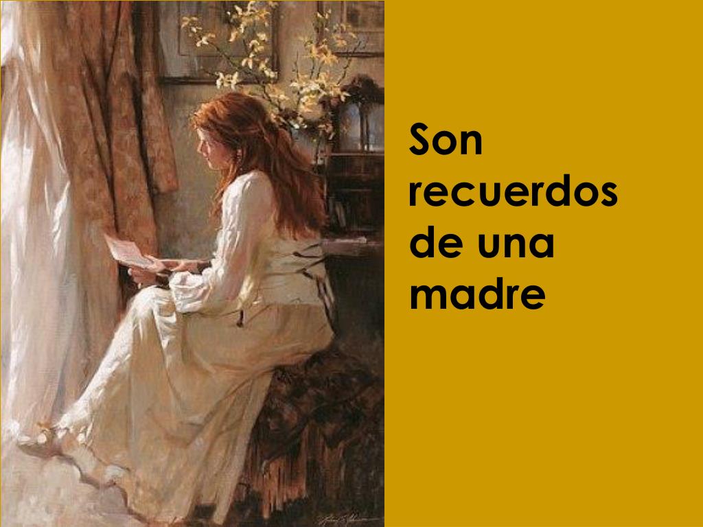 Hoy recuerdo la iglesia de mi pueblo Hoy recuerdo el rosario de mi infancia Hoy recuerdo los días de mis rezos Hoy recuerdo tu nombre con nostalgia. Hoy recuerdo tu imagen del colegio Hoy recuerdo la salve que cantaba Hoy recuerdo tu ermita en aquel monte Hoy recuerdo que tú eres mi esperanza. Recuerdos de mi niñez Recuerdos de mi añoranza Son recuerdo de una fe Por la vida maltratada. Y que de golpe reviven Cuando el dolor se agiganta. Son recuerdos de una madre Que hoy se que nunca me falla. Hoy recuerdo los años temblorosos En que nace el amor entre las manos Y recuerdo que un día fui con el/ella A poner ese amor bajo tu amparo
