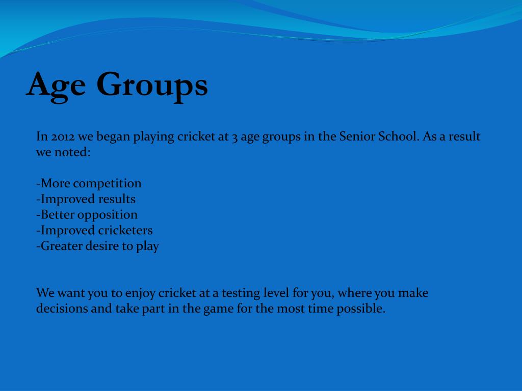 Age Groups • In 2012 we began playing cricket at 3 age groups in the Senior School. As a result we noted: • More competition • Improved results • Better opposition • Improved cricketers • Greater desire to play • We want you to enjoy cricket at a testing level for you, where you make decisions and take part in the game for the most time possible.