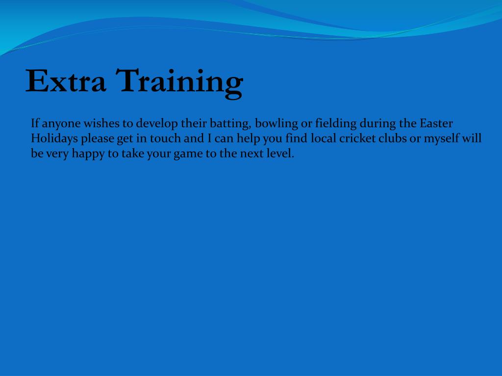 Extra Training If anyone wishes to develop their batting, bowling or fielding during the Easter Holidays please get in touch and I can help you find local cricket clubs or myself will be very happy to take your game to the next level.