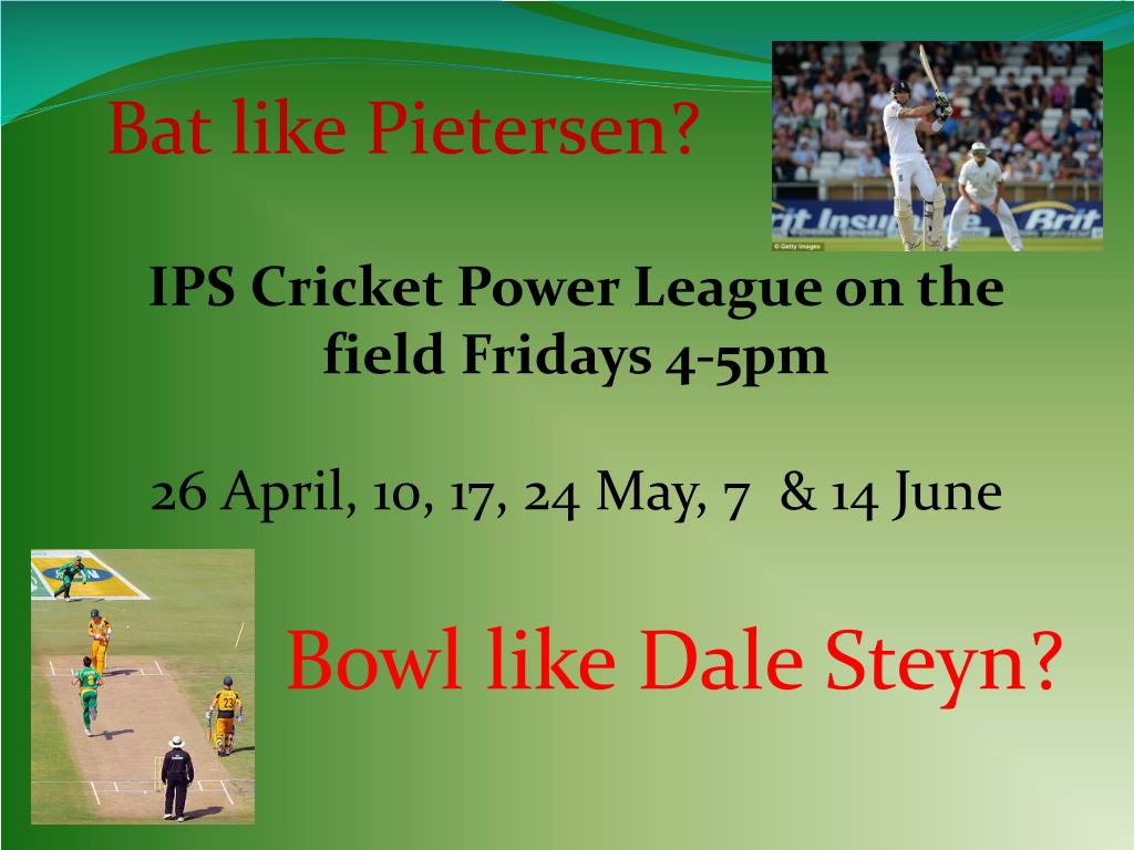 Bat like Pietersen? IPS Cricket Power League on the field Fridays 4-5pm 26 April, 10, 17, 24 May, 7 & 14 June Bowl like Dale Steyn?