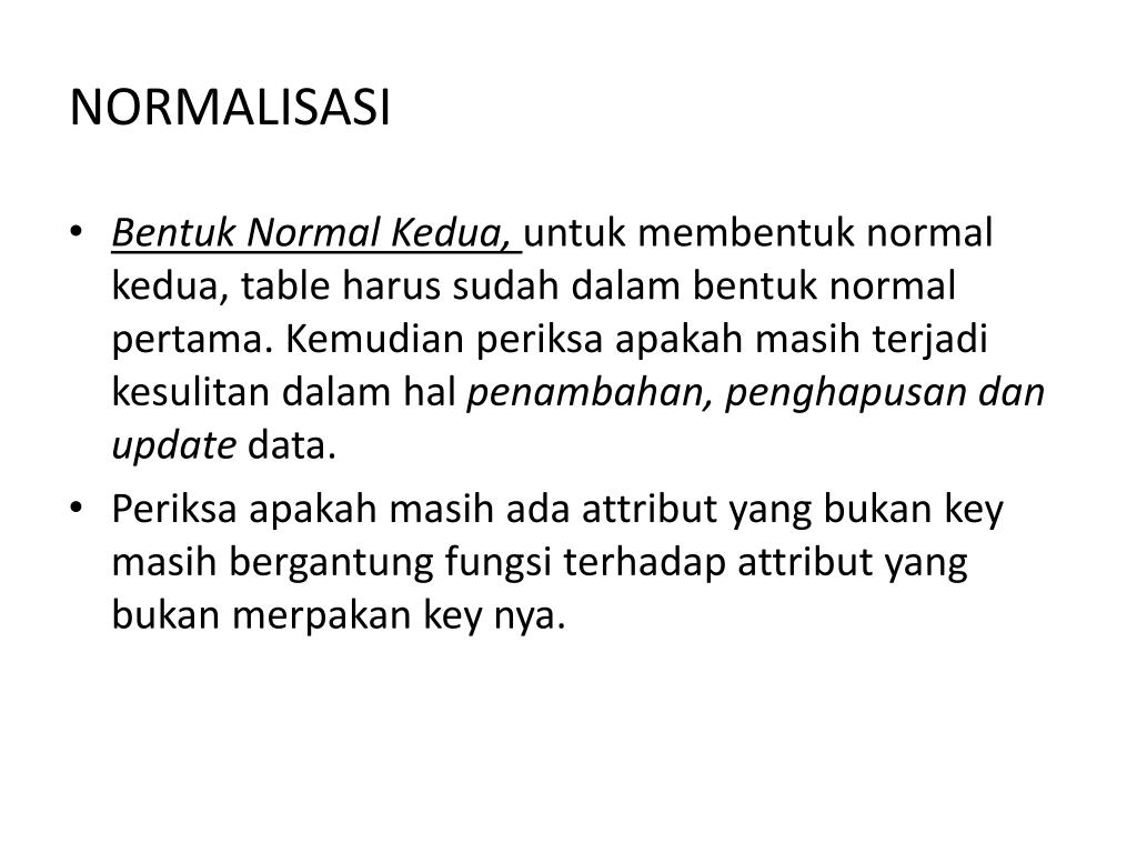 NORMALISASI • Bentuk Normal Kedua,untuk membentuk normal kedua, table harus sudah dalam bentuk normal pertama. Kemudian periksa apakah masih terjadi kesulitan dalam hal penambahan, penghapusan dan update data. • Periksa apakah masih ada attribut yang bukan key masih bergantung fungsi terhadap attribut yang bukan merpakan key nya.